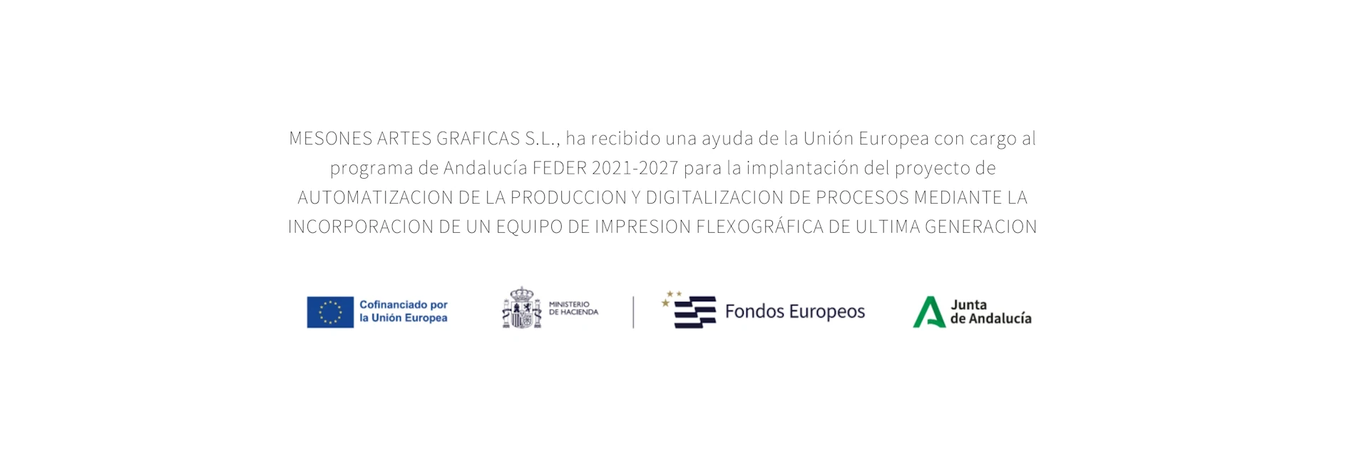 Mesones Artes Gráficas, S.L. ha recibido una ayuda de la Unión Europea con cargo al Programa Operativo FEDER de Andalucía 2014-2020, financiada como parte de la respuesta de la Unión a la pandemia de COVID-19 (REACT_UE), para compensar el sobrecoste energético de gas natural u/o electricidad a Pymes y autónomos especialmente afectados por el incremento de los precios de gas natural u la electricidad provocados por el impacto de la guerra de agresión de Rusia contra Ucrania.